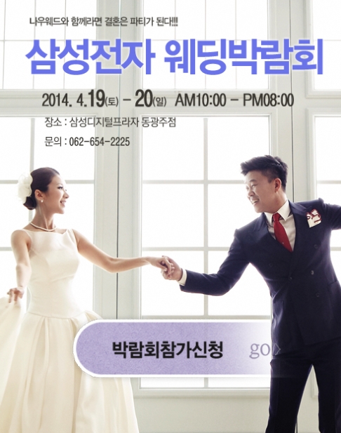 한편, 나우웨드는 지난해 머니투데이 소비자만족대상을 수상한 바 있는 웨딩컨설팅 업체로, 광주 외에도 서울, 수원, 평택, 대전, 부산, 대구, 포항, 창원, 전주, 제주 등 전국지사를 운영하고 있다. 참가신청은 광주 나우웨드 홈페이지(www.gjsamsungfair.com)를 통해 가능하다.
