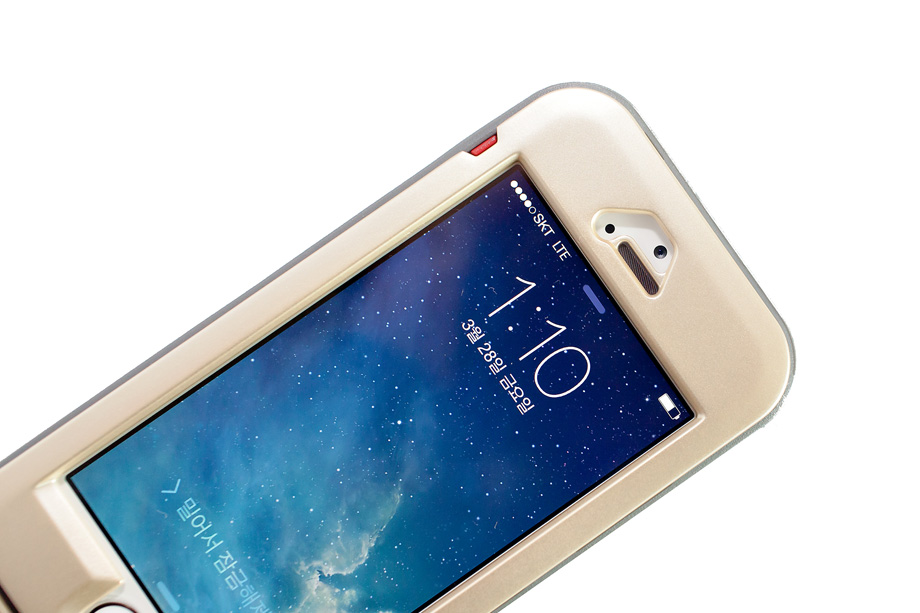 전면 플레이트까지 장착을 하였습니다. 이전에 제가 쓰던 충격방지용 케이스는 정말 주머니에 들어가지 않을 정도로 둔탁한 녀석이었는데 얘는 상당히 슬림한 모습을 보여주네요. 샴페인골드와 화이트의 조화가 상당히 좋습니다. 이런 충격방지 케이스를 별로 안 좋아하던 경아도 옆에서 보더니 이쁘다고 하네요. 확실히 얼마 전에 스마트폰 깨 먹은 효과가 있나 봅니다.
