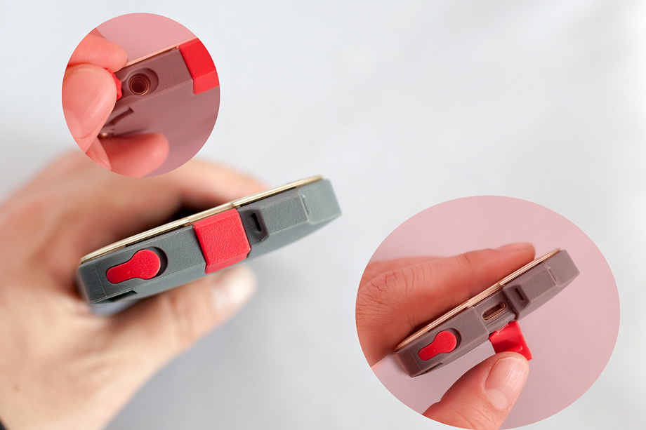 하단의 라이트닝케이블 포트와 3.5파이 오디오 포트를 커버로 보호를 하고 있어서 불의의 사고로부터 이물질이 스마트폰 안으로 유입되는 것을 막아주는 역할을 하고 있습니다. 부드러운 재질로 커버가 되어 있어서 힘을 많이 주지 않아도 괜찮네요.