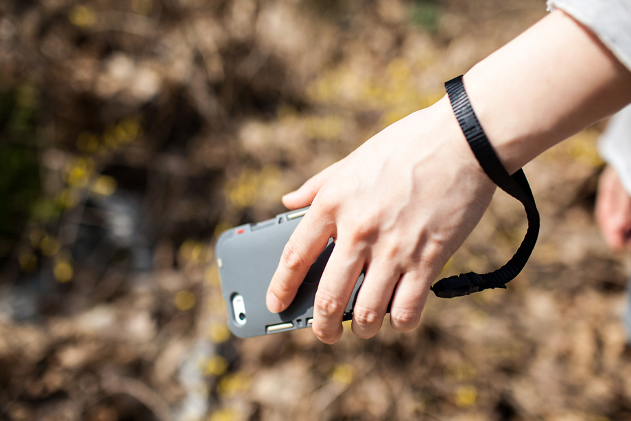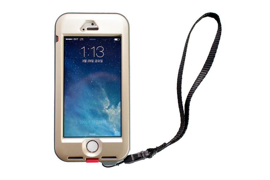 하단의 스트랩 고리에 핸드스트랩을 장착한 모습입니다. 등산을 하실때나 자전거를 타실때 손목에 걸고 타시면 상당히 편하시겠죠? 스마트폰을 놓쳐도 적어도 바닥에 추락할 위험은 막아주니 말이죠.