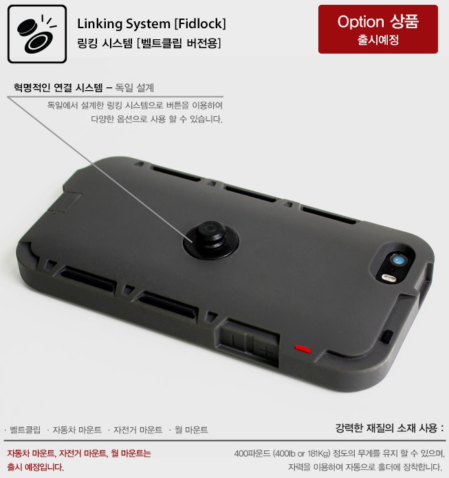 이 링킹 시스템이 들어 있는 케이스의 경우는 이곳에 강력한 재질의 소재를 사용한 링킹 시스템이 들어 있다고 합니다. 자력을 이용해서 자동으로 홀더에 장착되는 형식이라고 하는데요 아직까지는 벨트용 클립만 출시가 되었지만 추후 자전거, 자동차에 마운트 되는 월 마운트도 발매가 될 예정이라고 합니다.
