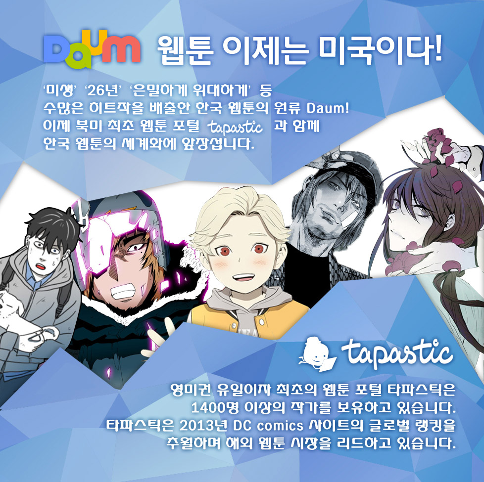 다음은 웹툰의 해외 진출을 본격화하기 위해 지난 1월 타파스미디어와 전략적 제휴를 체결한 바 있다. 상반기 5편을 시작으로 점차 북미 진출작을 확대해 글로벌 시장에서 다양한 장르의 원천소스 역할을 할 수 있도록 발전시킨다는 방침이다.