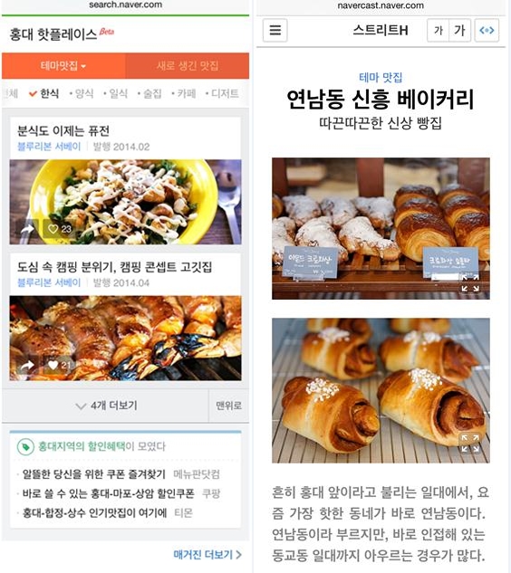 네이버는 ‘홍대 핫플레이스’가 홍대 전문 매거진 ‘스트리트H’와 국내 최초 맛집 평가서를 발간한 ‘블루리본 서베이’가 양질의 콘텐츠를 통해 맛집을 소개하는 서비스라고 설명했다. 모바일에서 ‘홍대 맛집’ 또는 ‘홍대 핫플레이스’로 검색하면 한식, 일식, 카페 등 카테고리별 맛집을 간편하게 확인할 수 있다.