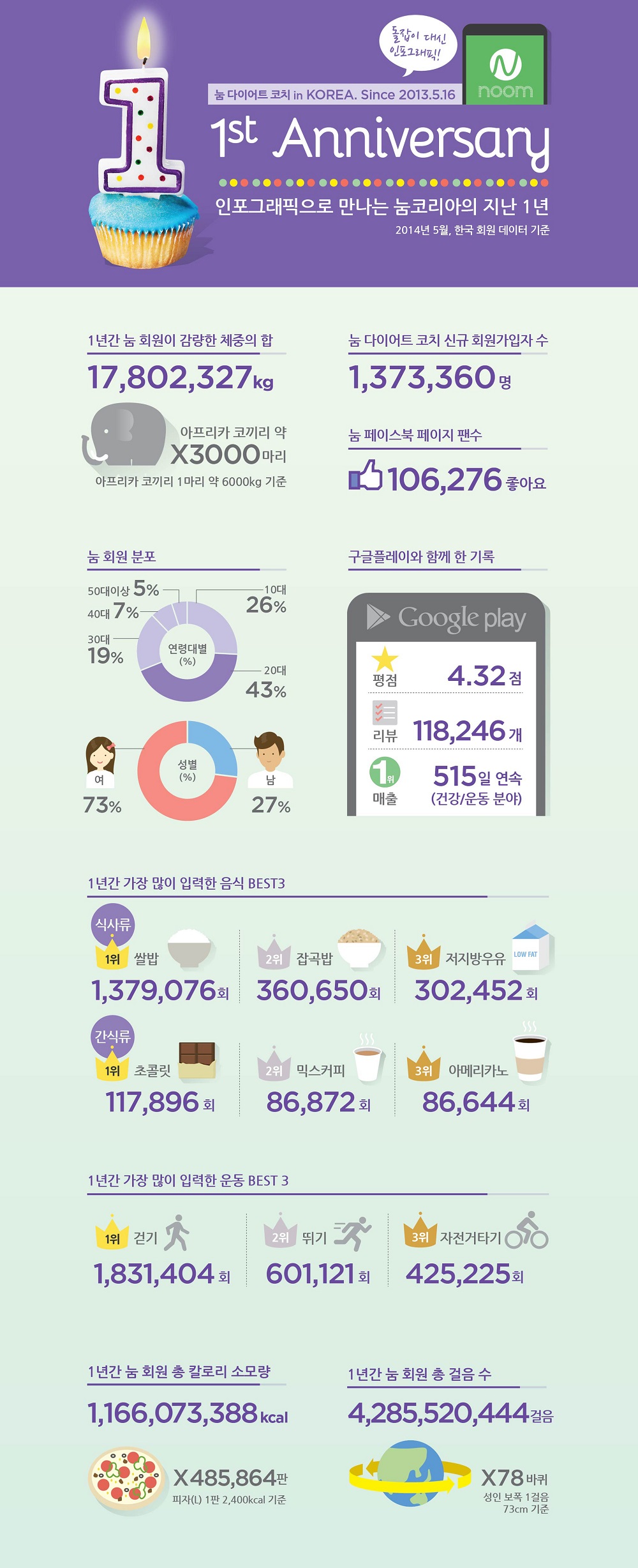눔코리아에 따르면, 2014년 5월 기준으로 ‘눔 다이어트 코치’ 신규 회원가입자 수는 1,373,360명으로, 지난 1년간 회원들이 감량한 체중의 합은 아프리카 코끼리 3,000여 마리의 무게와 같고, 걸음 수를 합치면 지구 78바퀴를 돌 수 있다.