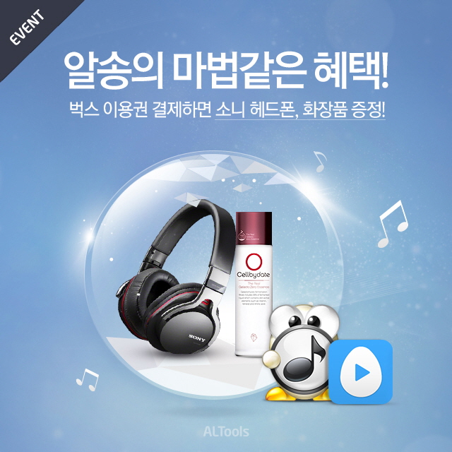 이스트소프트는 이번 업데이트를 기념, 알송에서 음원 스트리밍 서비스 벅스의 이용권을 구매한 사용자 총 33명을 추첨해 소니 헤드폰 MDR시리즈 및 셀바이데이트, 더 리얼 갈락토 제로 에센스 등을 증정하는 이벤트를 연다고 밝혔다.
