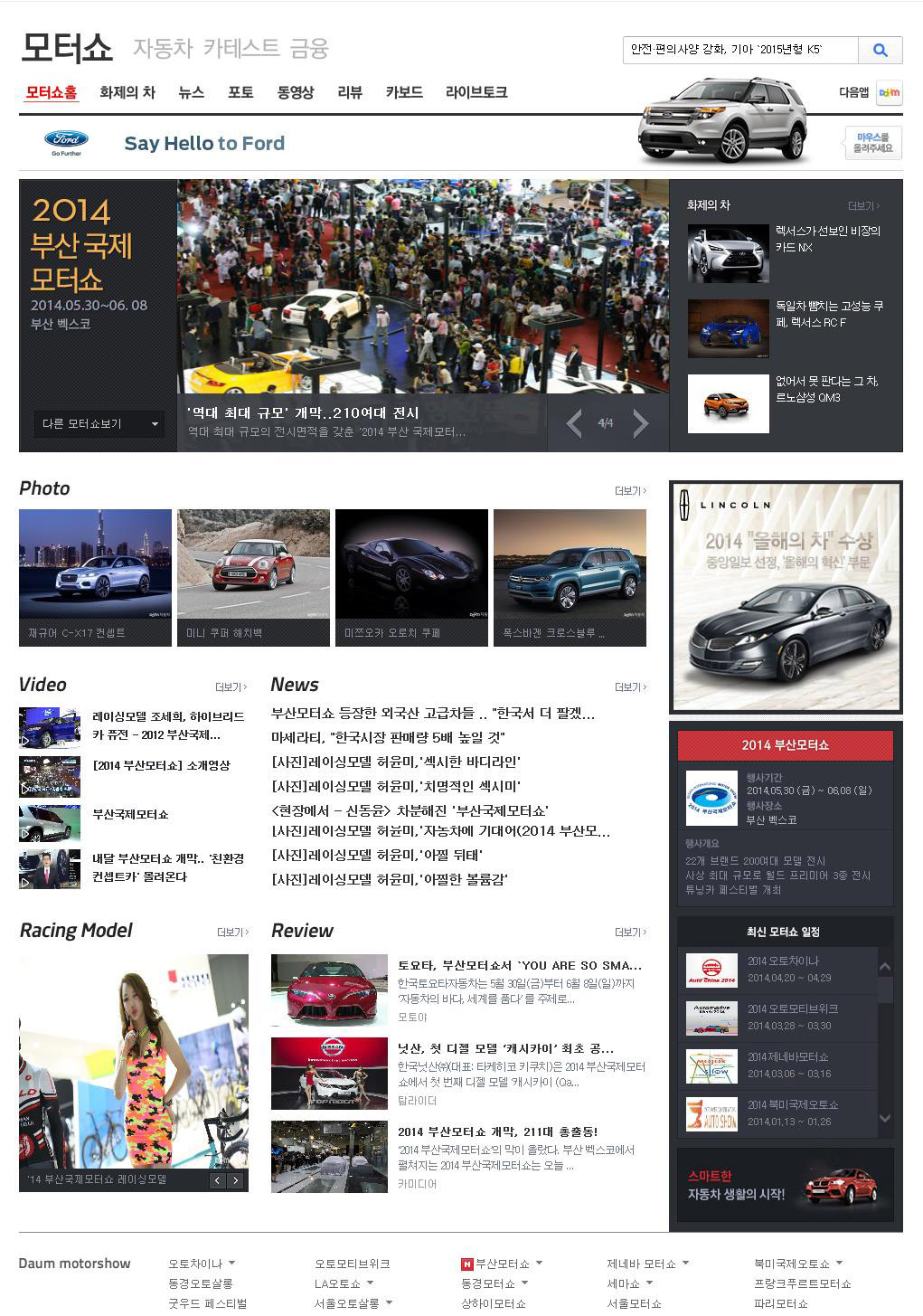 다음은 이번에 ‘다음 자동차’에 오픈한 ‘2014 부산국제모터쇼’ 특집페이지를 ▲모터쇼에 출품되는 차량을 다양한 부위별 포토와 함께 볼 수 있는 ‘화제의 차’ ▲모터쇼 관련 뉴스를 실시간으로 제공하는 ‘뉴스’ ▲모터쇼 현장 사진을 한 눈에 볼 수 있는 ‘포토’ ▲모터쇼 출품 차량을 생생하게 확인할 수 있는 ‘동영상’ ▲자동차 전문지들의 모터쇼 심층분석 콘텐츠를 제공하는 ‘리뷰’ 등으로 구성했다고 설명했다.