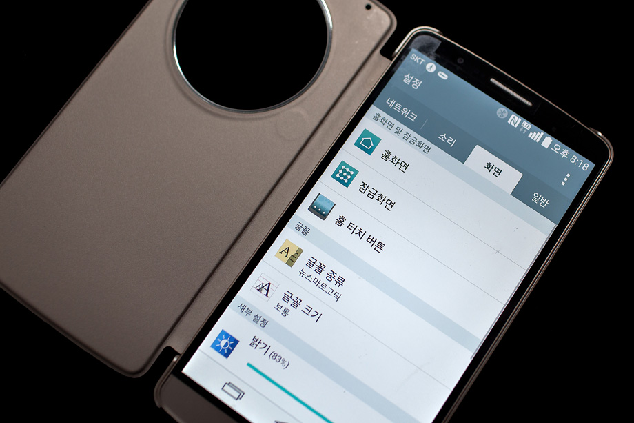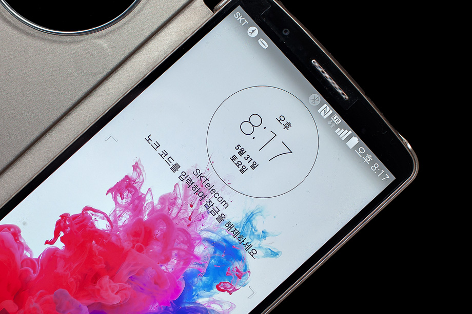 조금 줌인 해서 찍어 봤는데요. 좌측 케이스 재질도 보이고 우상단 스피커의 구멍도 보이고 그러는 사진입니다만 화면에 화소가 보이지를 않습니다. QHD 정말 끝내주는 듯... LG G3를 시작으로 QHD 폰들이 계속 나오겠죠? 다른 폰들은 어떨지 벌써 부터 기대가 되네요.