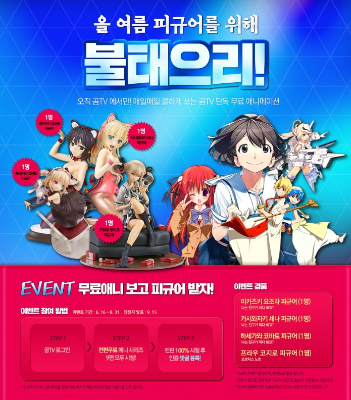 곰TV는 이를 기념해 피규어 4종을 내세운 경품 이벤트 ‘올 여름 피규어를 위해 불태으리’도 연다고 덧붙였다. 애니메이션 ‘나는 친구가 적다 NEXT’의 히로인 ‘미카즈키 요조라’, ‘카시와자키 세나’, ‘하세가와 코바토’ 피규어와 ‘로보틱스 노츠’의 ‘프라우 코지로’ 피규어를 제공한다.
