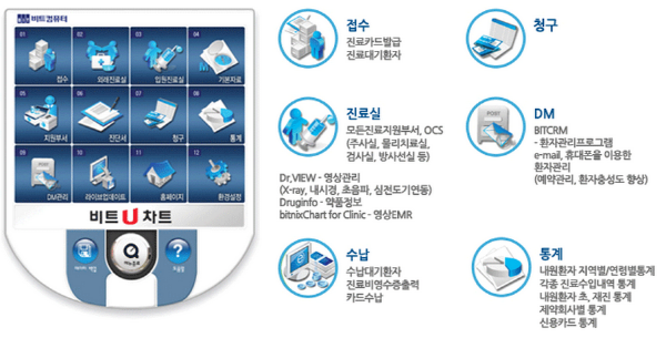 비트컴퓨터는 기존 개원의 전자차트를 업그레이드 한 병·의원 경영 솔루션 ‘비트U차트’를 보급하고 있다. 비트U차트는 대기실 디지털 방송시스템인 BITcast, 초음파·내시경 영상을 관리하는 PACS 뷰어, 오처방을 줄여주는 실시간 약품정보와 알러지체크 등 기능을 제공한다. 또 휴대폰과 이메일을 이용해 환자를 관리하고, 보건소에 보고를 대신하는 예방접종 EDI 등 기능을 제공한다.