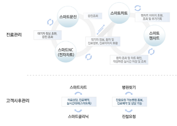 이중에서도 스마트폰, 태블릿PC와 같은 모바일 기기의 등장으로 의료 전자차트를 포함한 병·의원 경영 솔루션 분야에 변화가 두드러지게 나타나고 있다. 과거와 달리 모바일 기기를 활용해 의료진은 병원이 아니더라도 언제 어디서나 환자정보를 확인할 수 있어 의료서비스를 제공하는 의료인들에게도 쉽고 편리한 업무환경을 만들어 준다. 또 의료진과 환자 사이의 커뮤니케이션도 보다 원활하게 이뤄져 환자 중심의 진료 서비스를 확대 제공할 수 있다.