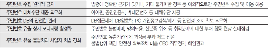 개인정보보호법 개정안은 법령상 근거가 없는 경우에는 대체수단 도입 등을 통해 주민번호를 수집하지 않도록 했으며, 기 보유한 주민번호는 법 시행 2년인 2016년 8월 6일까지 파기하도록 하고 있다. 뿐만 아니라 주민번호 수집을 요구하는 업무절차나 내부규정, 그리고 서식 개선까지 병행해야 한다.