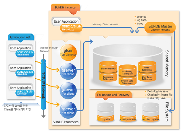 SUNDB는 특정 애플리케이션의 오류를 전체 데이터베이스 시스템 오류로의 확산 방지를 위해 쓰레드 구조가 아닌 공유 메모리(Shared Memory) 기반 멀티 프로세스(Multi Process) 구조를 채택해 로우 레이턴시(Low Latency)를 제공한다. 기존 인메모리 DBMS의 한계점으로 지적되던 하드웨어 리소스의 과다 사용을 억제하며 하드웨어 확장에 따른 선형적 성능 보장이 가능하다.