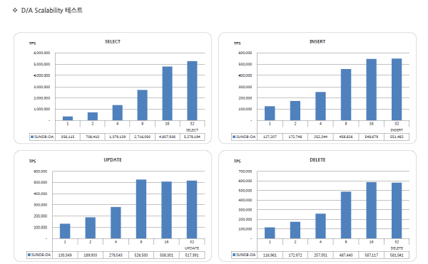실제 SUNDB는 네트워크 통신비용 발생 유무와 관계없이 빠르고 안정적인 성능을 보여준다. 자체적으로 실시한 테스트에서 SUNDB는 네트워크 통신비용의 발생 없이 메모리에 직접 접근하는 메모리 D/A 방식(Memory Direct Access Mode)에서 DML(Select/Insert/Update/Delete) 연산에 대한 TPS를 수행한 결과, SELECT는 경쟁 제품 대비 최소 11~23배, Insert/Update/Delete 측면에서도 수 배 이상의 성능을 보였다. 기존 인메모리 DBMS의 한계인 클라이언트 수 증가에 따른 선형적인 확장성(Scalability)을 증명하며 로우 레이턴시에 탁월한 성능을 기록했다.