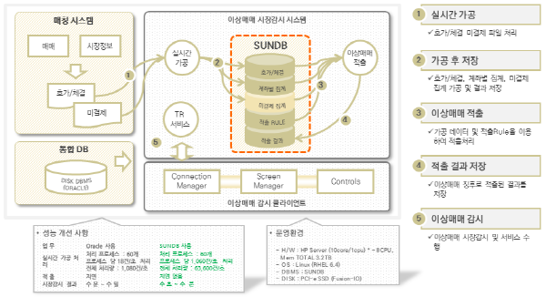 한국거래소(KRX)가 지능화된 불공정거래 예방 및 감시에 요구되는 이상매매를 적출하기 위해 구축, 운영하고 있는 시장감시시스템에 급증하는 호가/체결 미결제 파일 데이터를 즉시 가공해 시장 감시에 반영할 필요가 있다고 판단, SUNDB 도입을 결정했다.