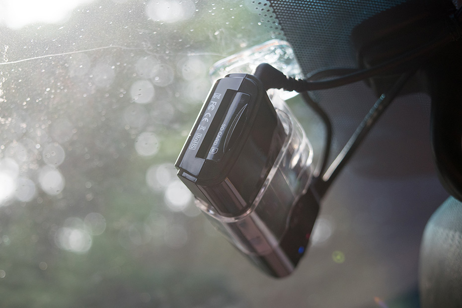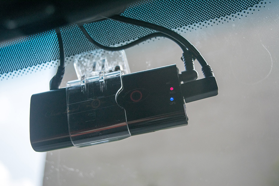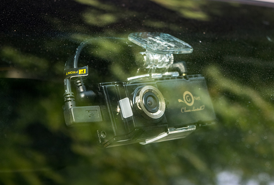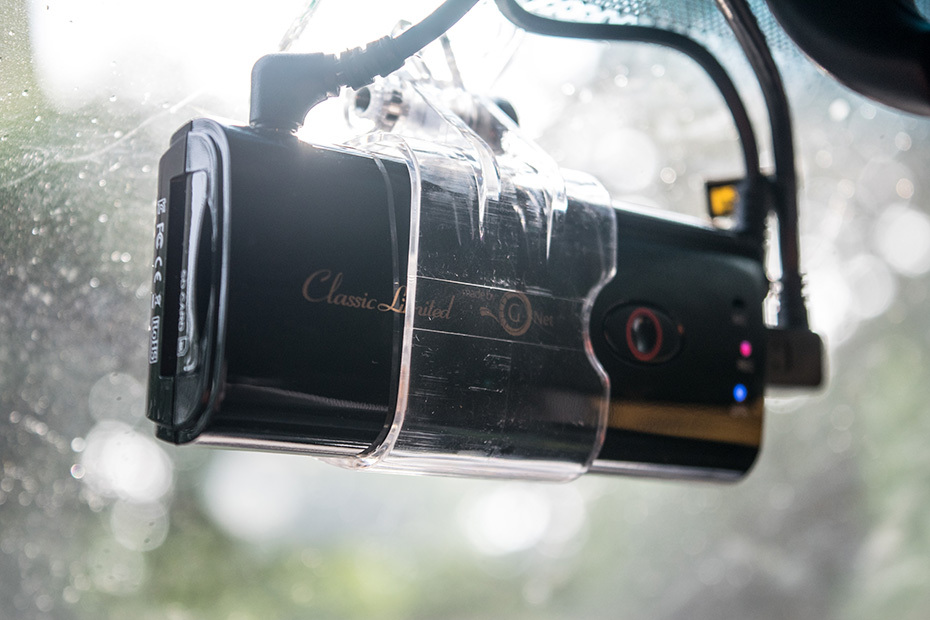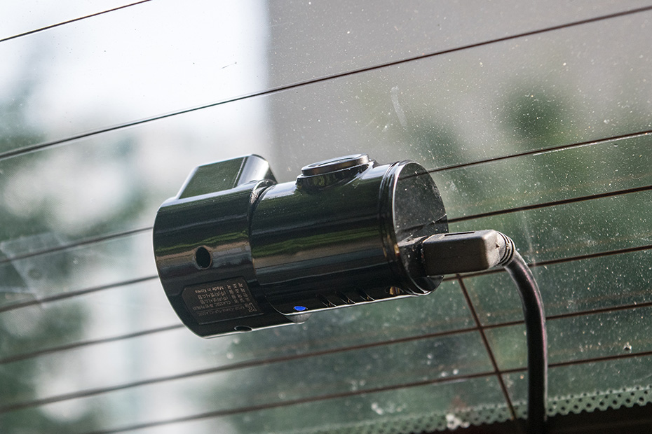창착기를 쓰려 했더니 도대체 우리차는 언제 세차를 한 자동차인지... 그래도 안쪽에서 보면 야누스의 눈이 달린듯한 블랙박스의 디자인은 인상적 입니다. 우측에는 녹화 상태와 GPS 상태 LED가 켜 있는 것이 보이는군요. GPS와 상시전원 케이블은 별매입니다.