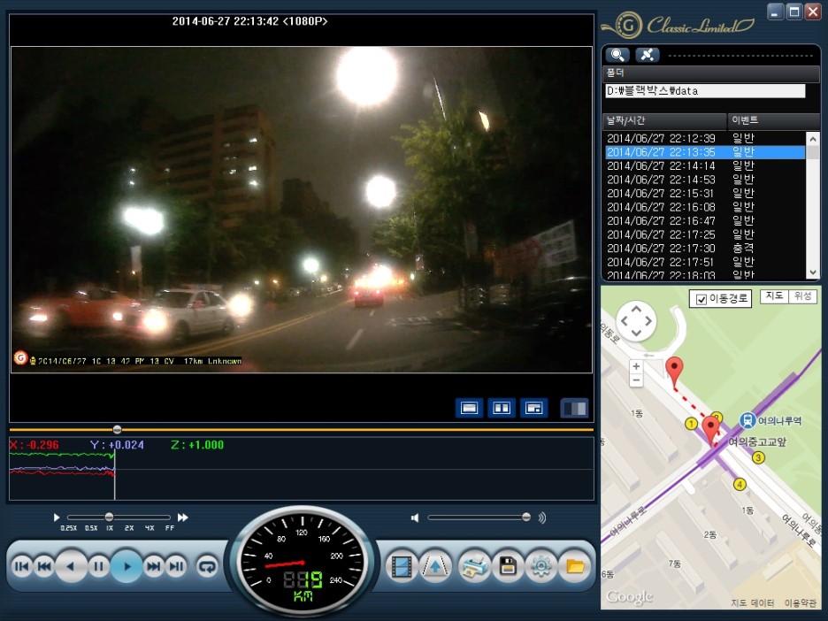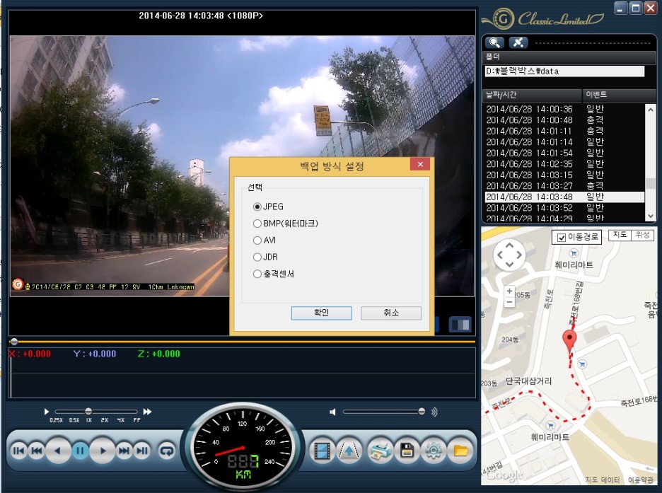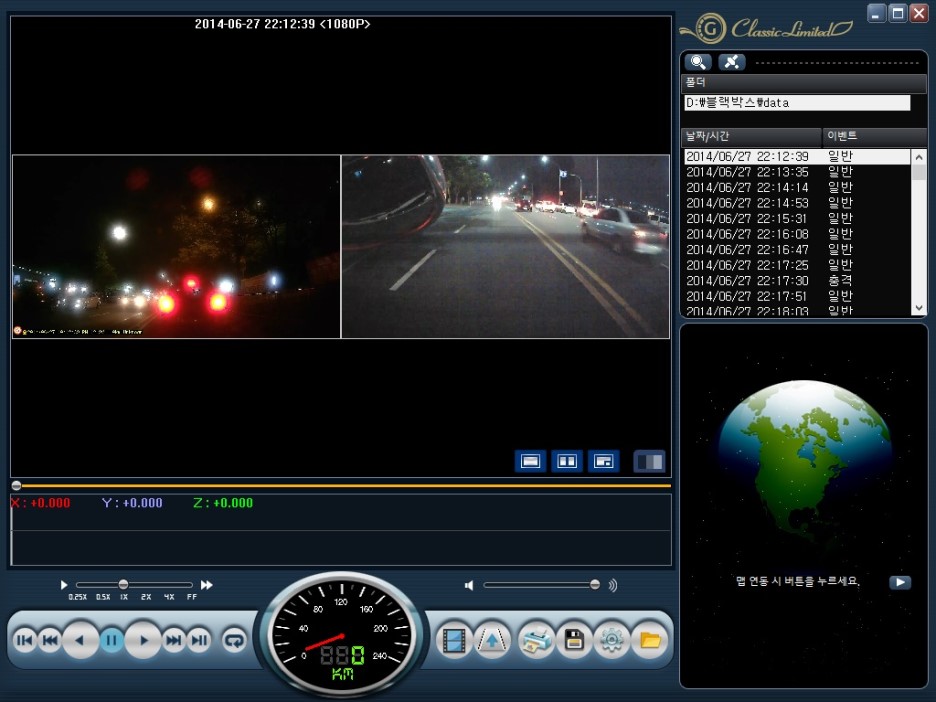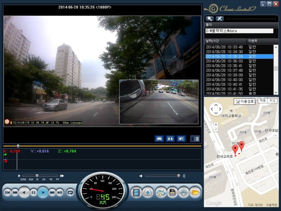 외장 GPS를 구매하셨다면 현 영상이 어디서 찍히고 있는지 확인하실 수 있습니다. 지도의 상단에는 영상이 언제 어떤 이벤트로 찍혔는지 표시를 해 주고 있네요. 이런식으로 전방만 후방만 보는 것도 가능합니다.