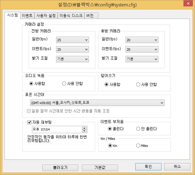 전용프로그램에서도 야누스 블랙박스의 설정을 하실 수 있습니다만 이곳에 있는 대부분의 설정은 스마트폰이랑 와이파이를 연결해서 바꾸는 것이 가능합니다. 재차 강조하지만 가장 장점이라 생각합니다. 굳이 블랙박스에서 메모리를 빼내지 않아도 스마트폰에서 영상확인이 가능하고 설정도 가능하고요.