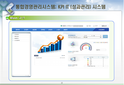 KPI IT (성과관리)시스템은 정보 접근성 및 정보활용 고도화 측면에서 Infographics 지능형 대쉬보드를 제공한다. BPS, SBS 및 KPI pool의 연동을 통해 평가, 분석된 데이터를 하나의 대쉬보드 상에서 검토하고 활용할 수 있도록 하고, 대쉬보드의 항목 구성, 자동 리포팅 기능으로 통합경영관리시스템의 최종목표인 최적 경영효율 및 사업 성과관리를 지원한다.