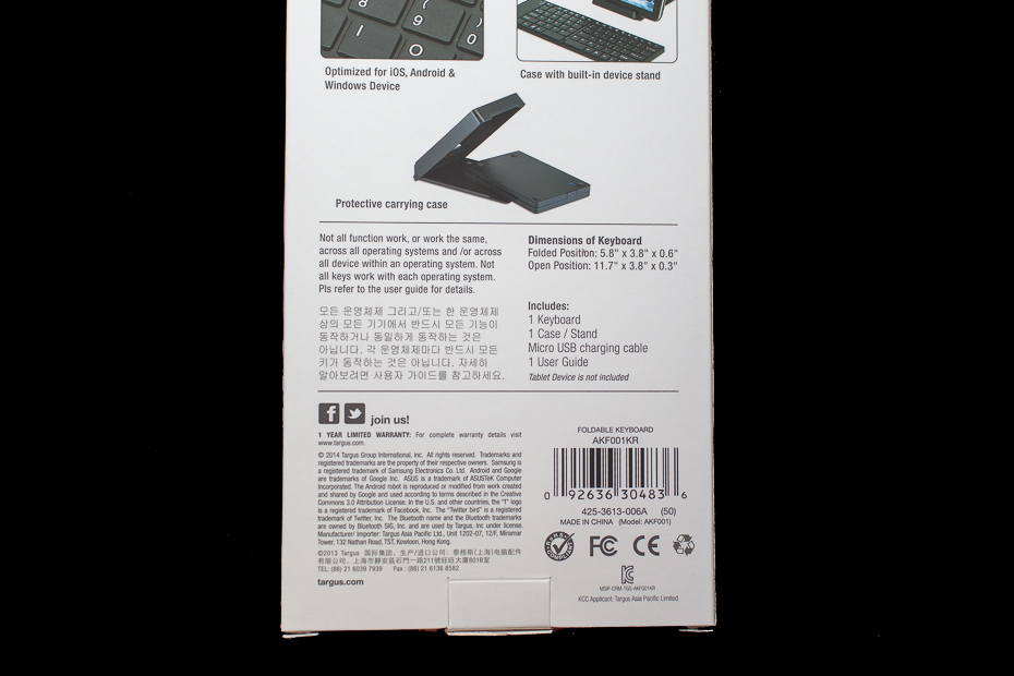 주변기기 전문 업체 타거스 ( http://targus.com/kr ) 에서 발매한 AKF001KR은 블루투스 방식을 가진 키보드로서 다른 키보드와 다르게 반으로 접히는 접이식 키보드 인것이 특징입니다. 접이식 키보드라고 하면 이미 나와 있지 않냐고 반문을 하신다면 타거스 AKF001KR은 키보드 케이스가 거치대 역활을 하면서 안드로이드 태블릿PC나 아이패드 그리고 윈도우까지 OS를 가리지 않고 호환이 되어서 더 좋다고 말씀 드리고 싶네요.