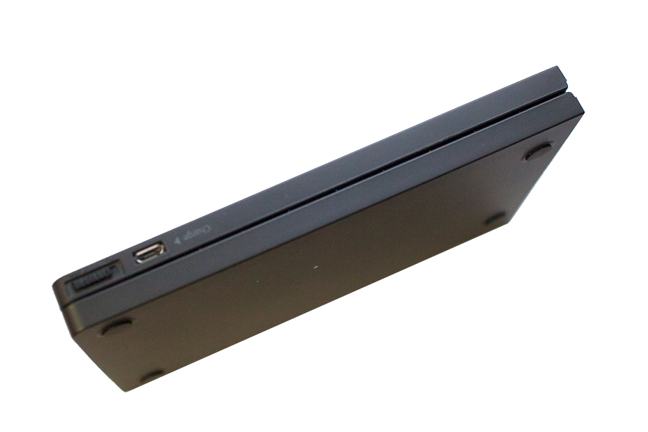 전원 온/오프 스위치가 상단에 있으며 충전은 마이크로 USB 포트를 통해서 합니다. 완전 방전 후에 완충까지 두시간 정도가 걸린다고 하네요.