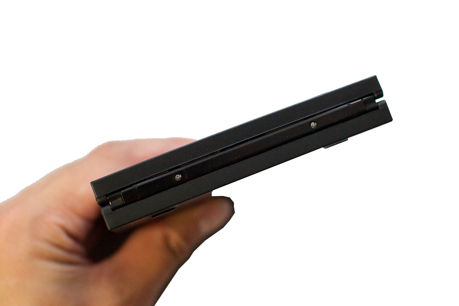 펼친 모습입니다. 폴딩 된 부분의 넓이가 넓지 않아서 상당히 좋네요. 펼친 상태의 크기는 11.7mm x 4.8mm x 0.3mm 의 컴팩트한 크기를 자랑합니다. 작지만 자판의 크기가 상당히 큰 편이라서 타이핑 하는데 불편함은 느껴지지 않더군요. 노트북들 처럼 키보드 위치를 마구 변경해 놓은 것이 아니라서 상당히 맘에 들었습니다.