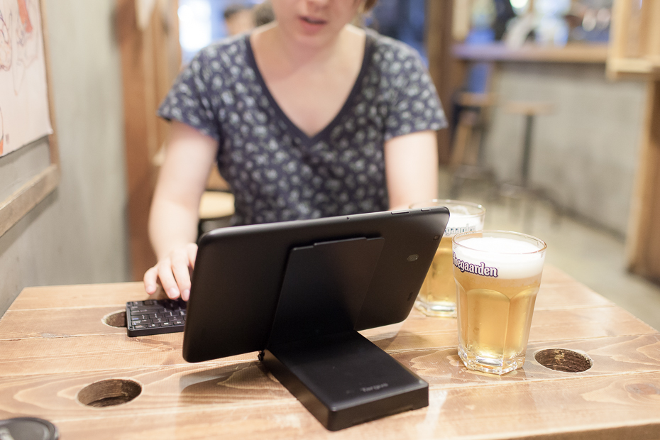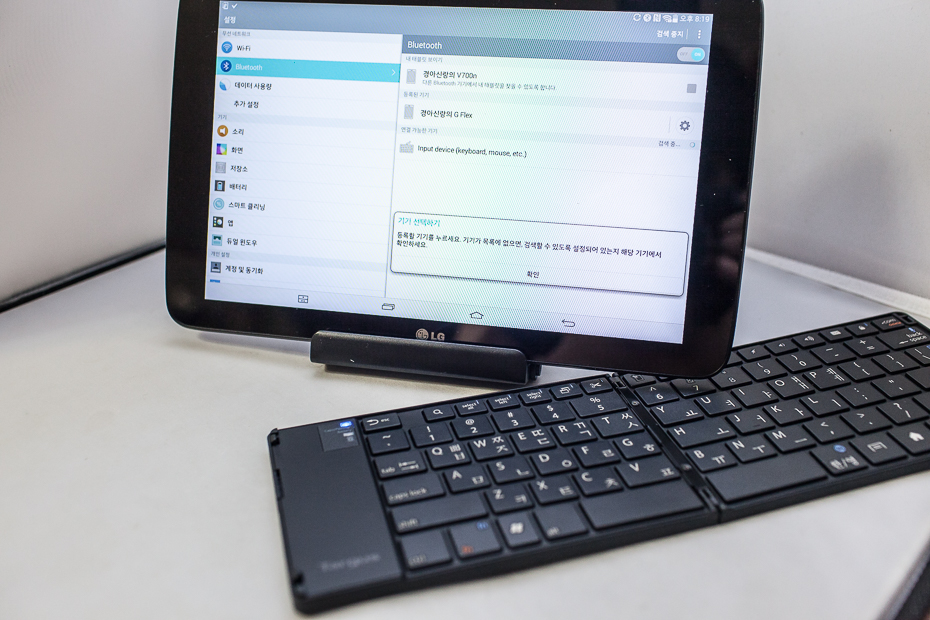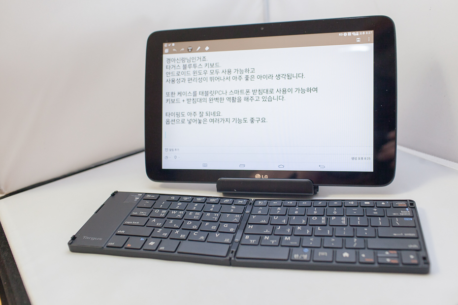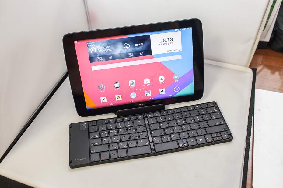 엘지 G패드 10.1 을 케이스겸 거치대에 거치를 하고 키보드를 펼쳐 놓은 사진입니다. 마치 일체형 PC를 보는 것 처럼 잘 어울리지 않나요? 이 상태라면 커피샵 같은데서도 노트북 유저 부럽지 않게 놓고 잘 사용할 수 있으리라 생각 됩니다.