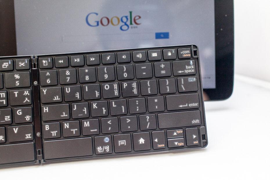 폴딩이 되어서 크기가 작은 것과 거치대가 있고 다양한 기능이 있다는 것 외에 키보드 본연의 기능도 상당히 만족 스러워서 좋습니다. 물론 기계식 같은 타이핑감을 기대할 수는 없겠지만 키보드 배열 자체가 기존에 쓰던 배열과 같아서 키보드 입력을 하는 것이 어색하지 않고 쓰던 키보드 쓰는 것 처럼 자연스럽게 입력이 되어서 좋네요.