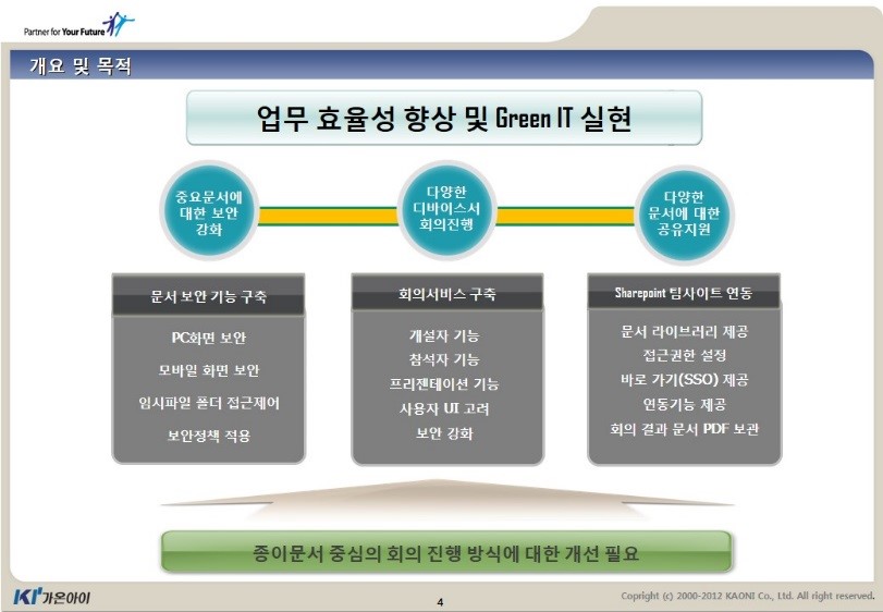 이러한 상황에서 Green IT 개념을 업무환경에 적용한 가온아이의 ‘ezPaperless’가 주목받고 있다. ezPaperless는 ‘종이 없이 회의하는 회의솔루션’으로 Green IT를 실현하면서 스마트한 회의환경을 제공한다.