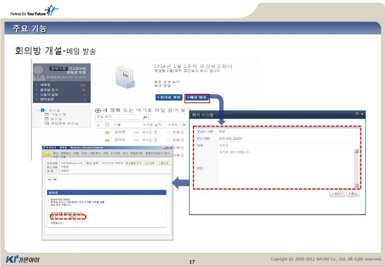 회의를 시작하기 전, 회의관련 담당자가 회의 등록 및 회의에 참석할 인원을 설정할 수 있다. 이때 조직도 및 회의안내 메일 자동 전송을 지원한다. 또한 회의방을 개설하면 회의자료를 미리 업로드해 배포할 수 있는데, 미리 문서를 배포 및 열람해야 할 경우에 ‘첨부파일 열람기간 설정’기능을 통해 효율적으로 배포 및 사용할 수 있다.