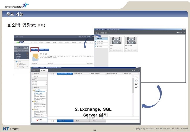 가온아이 ezPaperless는 MS Sharepoint 기반의 회의솔루션으로, 회의실 개설, 회의실 판서, 회의자료 공유 등의 다양한 기능을 부가적으로 구현해 회의에 사용되는 종이 문서를 줄일 뿐 아니라, 회의진행, 다양한 디바이스 지원, 문서공유지원, 문서보안등의 특화된 기능을 통해 회의실 사용자의 업무 편리성과 효율성을 높일 수 있다.