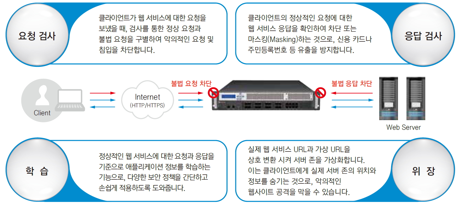 특허 받은 멀티코어 CPU 환경에서 고성능 패킷 처리가 가능하고, 보안과 관리모듈의 이원화 된 구조로 빠른 네트워크 처리와 보안위협의 빠른 분석·대응을 동시에 제공한다. 또한 차별화된 스위치형 어플라이언스 형태로 서버와 웹 방화벽 구간에 별도의 스위치 장비를 둘 필요 없어 네트워크 구성의 간소화 및 운영 효율성을 꾀할 수 있다.