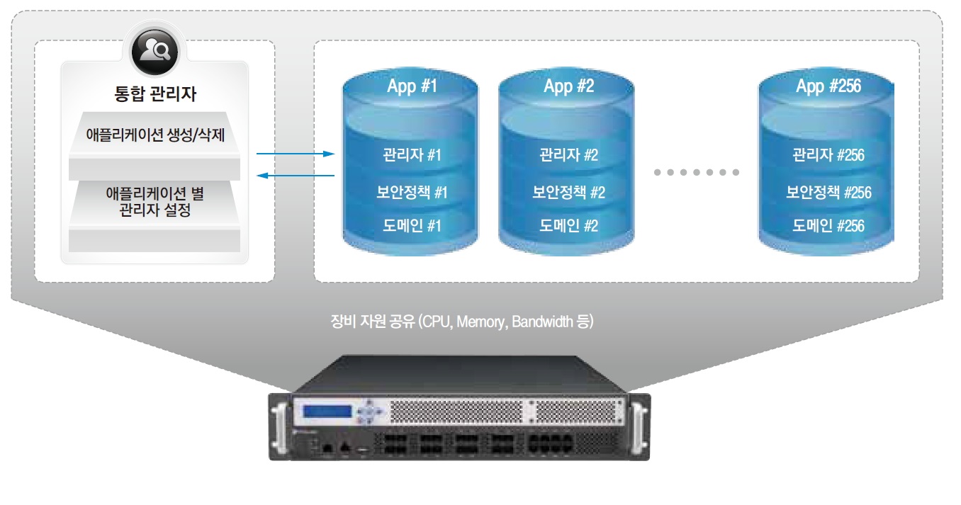 또한 클라우드 서비스(XaaS)를 위한 ‘앱테넌트(AppTenant)’ 기능으로 웹 애플리케이션 단위의 독자적인 보안설정 및 관리가 가능하다. 하나의 웹프론트-K는 최대 256개의 애플리케이션을 별도로 관리할 수 있어 비즈니스 요구 변화에 빠르게 대응할 수 있다.