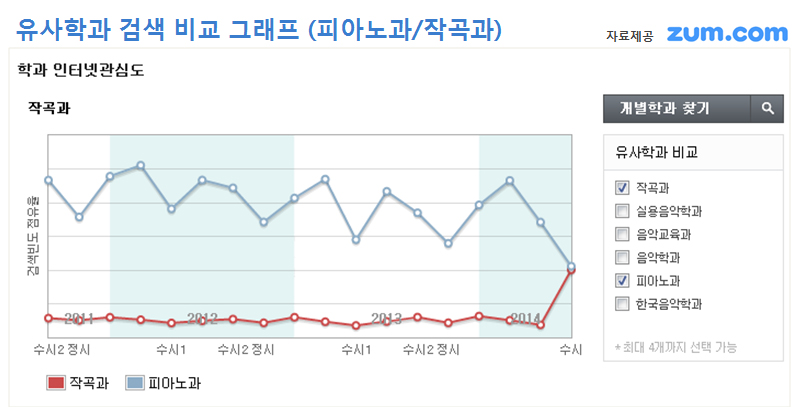 한편 줌인터넷은 ‘학과 인터넷관심도’ 변화 추이를 줌닷컴을 통해 보다 자세히 알 수 있다고 설명했다. 검색어로 입력한 학과의 관심도 변화 추세와 더불어 연관 학과의 관심도 변화도 차트 그래픽으로 제공된다.