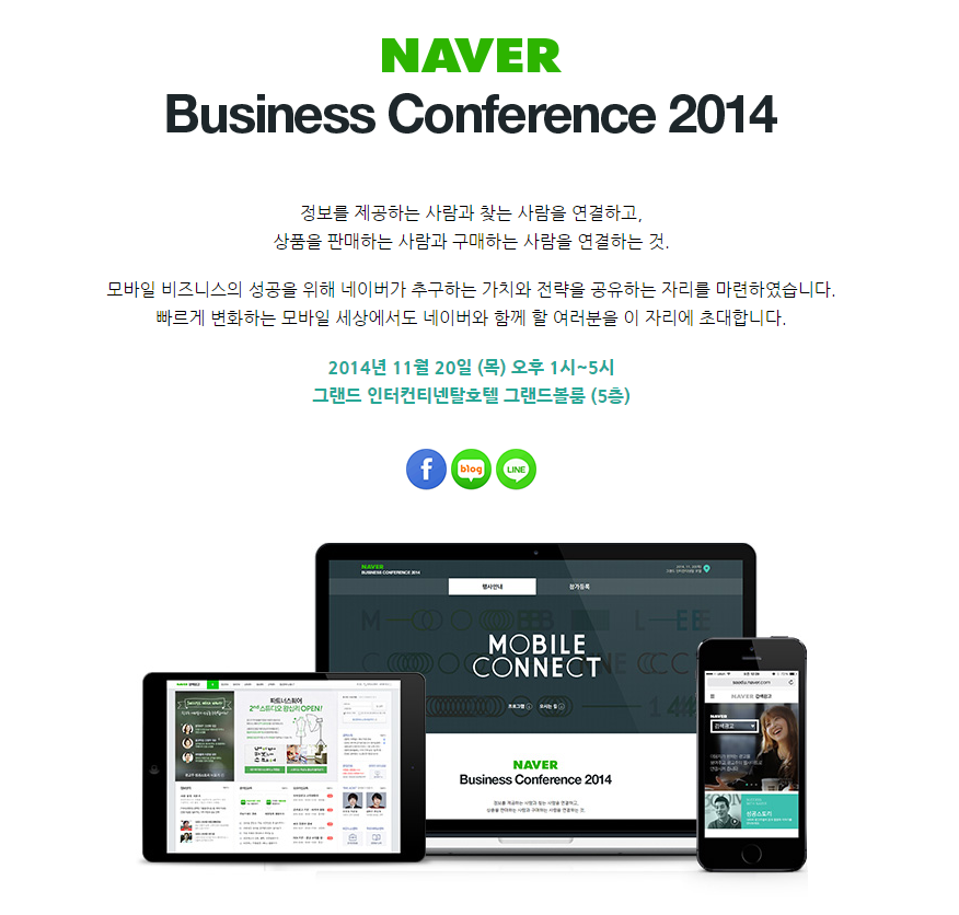 11월 20일 코엑스에서 열릴 예정인 ‘네이버 비즈니스 컨퍼런스 2014’는 사업가나 마케팅 업계 관계자 및 모바일 마케팅에 관심 있는 사용자들에게 모바일 비즈니스 전략과 방향성을 제안하는 행사다. 행사 홈페이지에서 무료로 신청 가능하며, 선착순으로 진행된다.
