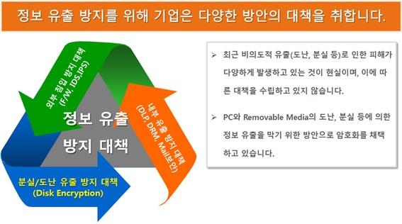 이 같은 문제를 해결하기 위해 기업들은 다양한 대책을 마련하고 있다. 대표적으로 F/W, IDS, IPS 등 외부 침입방지 대책과 DLP, DRM, 메일 보안 등 내부유출 방지대책, 그리고 디스크 암호화(Disk Encryption) 등 분실 도난 유출 방지 대책 등을 들 수 있다.