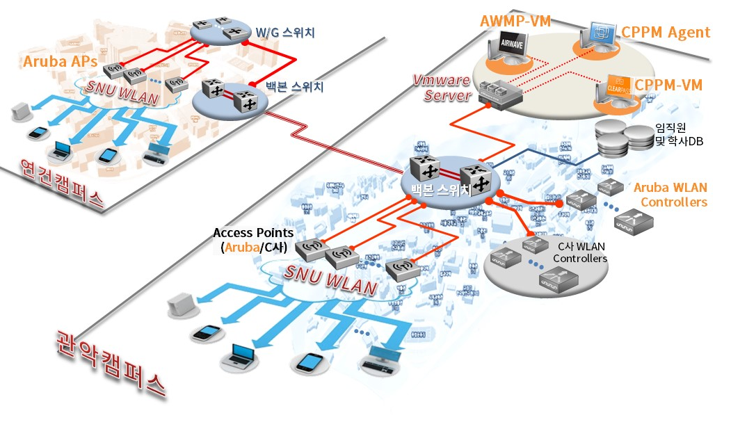 아루바는 서울대학교의 교육용 무선랜 인프라 확장을 위해 이동성∙보안성∙확장성∙고성능이 보장된 자사의 무선랜 솔루션을 도입했다. 아루바 7220, 3600 콘트롤러와 AP, 액세스 POE 스위치와 함께 기존 장비를 활용해 무선랜 인프라를 구성했고, 무선 장비의 통합관리 및 네트워크 가시성을 확보하기 위해 아루바 에어웨이브를 도입했다. 인증서버에는 손쉬운 방문객 관리를 돕는 게스트 솔루션과 모바일 기기 관리를 돕는 퀵커넥트 기능을 지원하는 클리어패스를 도입했다.