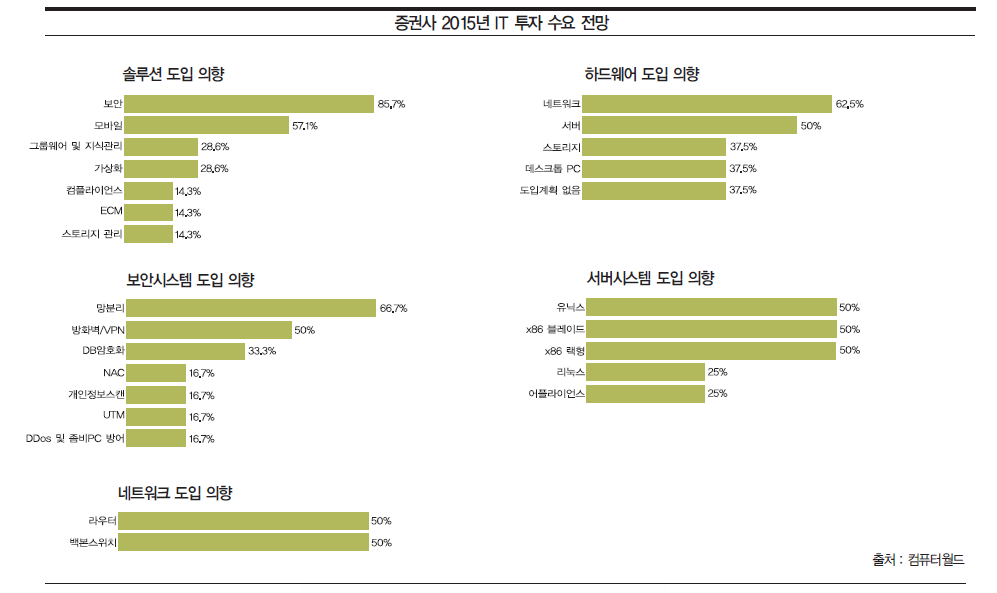 이외에도 국내 증권사들은 2015년 방화벽/VPN(50%), DB암호화(33.3%), NAC(네트워크 접근제어, 16.7%), 개인정보스캔(16.7%), UTM(통합보안장비, 16.7%), DDoS 및 좀비PC 방어(16.7%) 솔루션을 도입할 계획인 것으로 나타났다. 더불어 본지 조사에 응한 증권사들의 경우 노후화된 방화벽 장비를 교체하는 과정에서 신규 방화벽 혹은 신규 UTM 도입 사업을 진행할 예정이라 답변했다.
