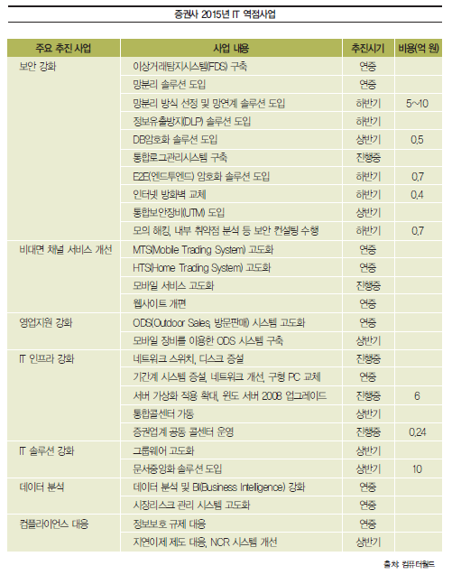그는 이어 “2015년은 전통적인 주식 거래 수단인 HTS(Home Trading System)의 거래 비중을 MTS가 넘어서는 원년이 될 것이다. 이미 일부 증권사에서는 2014년 말 거래 비중이 역전됐다. 증권업계의 IT 투자가 지속해서 감소하고 있음에도 불구하고 MTS에 대한 투자는 강화될 것으로 보인다”고 말했다. 비대면 영업 중에서도 모바일 채널을 활용한 영업 비중이 점차 늘어날 것이며, 이를 지원하는 시스템 수요 역시 증가할 것이란 전망이다.