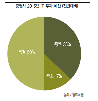 이러한 분위기가 IT 투자로 이어지고 있다. 본지가 국내 8개 증권사를 대상으로 ‘2015년 IT 수요조사’를 실시한 결과, 전년 대비 IT 투자 예산을 증액한 곳이 전체의 33%에 해당하는 것으로 나타났다. 비록 조사 대상 증권사 절반이 IT 예산을 동결했지만, 전년에 비해서는 훨씬 나아진 상황이다. 2014년의 경우 IT 투자 예산을 늘린 증권사를 찾아보기 어려웠다. 예산이 동결된 증권사가 전체의 80%를 차지했었다.