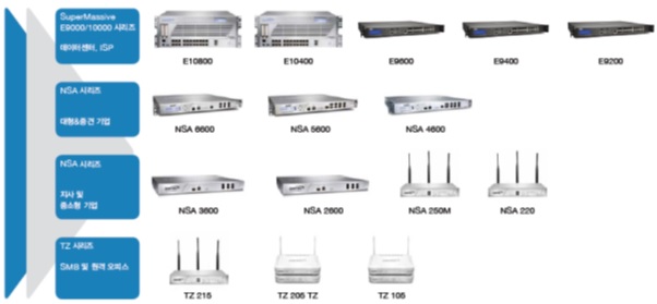 델 소닉월 NGFW 제품군은 크게 슈퍼매시브(SuperMassive) 시리즈와 네트워크 보안 어플라이언스(NSA) 시리즈, TZ 시리즈로 이뤄져 있다.