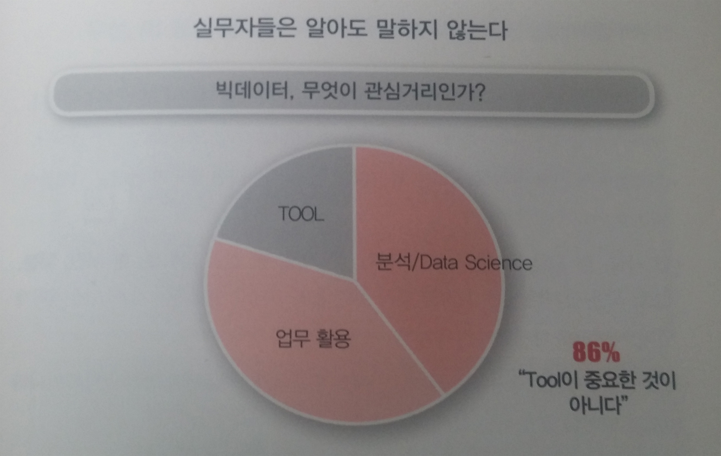 기업이 원하는 빅데이터의 중요성은 Tool이 아니라, 분석과 업무활용이라는 응답이 86%를 차지하고 있다. 즉, 이 결과는 실무진에서는 빅데이터를 통한 업무의 변화를 도모하고 있지만 CEO의 결단(재가)을 원하고 있으며, 눈치를 보고 있다는 이야기가 될 것이다.