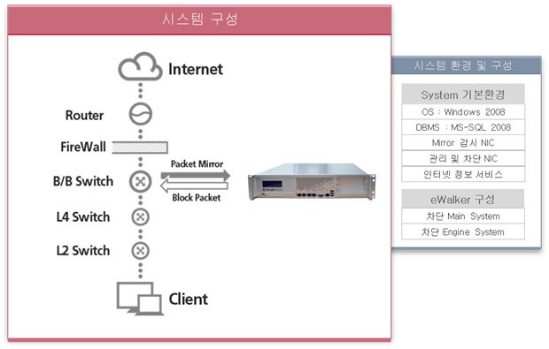 첫째, 이워커 시큐리티 V7은 설치 및 관리가 용이하다. 고객사 네트워크 재구성이 필요 없는 미러링 방식의 동작으로 장애 발생 포인트가 없는 최적의 관리 환경을 제공하며, 윈도우즈 서버 및 상용 DBMS 사용으로 손쉽게 설치 및 관리할 수 있다.
