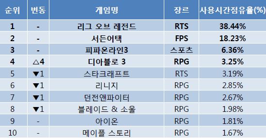 PC방 사용시간도 큰 폭으로 올랐다. 1월 4주차에서는 지난주 보다 83.63%나 증가했다. 이 영향으로 ‘스타크래프트’, ‘리니지’, ‘던전 앤 파이터’, ‘블레이드&소울’ 등은 각각 1계단씩 내려가 5위, 6위, 7위, 8위를 기록했다. 특히 ‘디아블로 3’가 PC방보다는 집에서 즐기는 게이머가 더 많은 게임인 걸 고려하면 실제 게이머들은 이보다 훨씬 많을 것으로 예상된다.