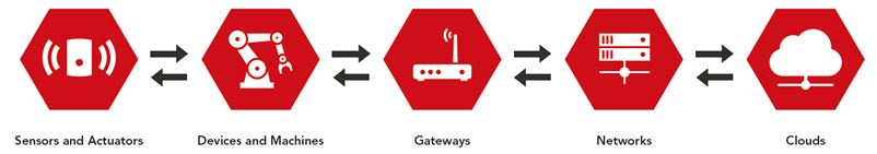 일반적인 IoT 토폴로지 또는 구조상에서, 데이터는 다음과 같은 여러 가지 요소를 통과하게 된다.