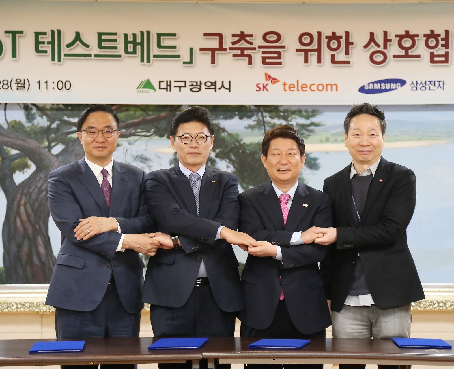 이를 위해 권영진 대구시장, 이형희 SK텔레콤 사업총괄, 김영기 삼성전자 사장, 김선일 대구창조경제혁신센터장 등은 28일 대구광역시 청사에서 ‘대구 IoT 테스트베드’ 구축을 위한 IoT 인프라 구축, 에너지 효율화, 상생펀드를 통한 벤처·스타트업 지원 등의 실행 전략을 발표했다. IoT 시범도시 구축을 위한 첫발을 내디딘 것이다.
