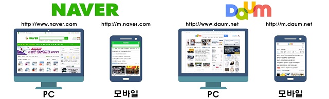 반면, 앞서 말한 복잡한 기업 업무시스템이나 콘텐츠 내용이 많은 쇼핑몰, 포털 사이트 등은 어떻게 구현할 것인가? 국내 대표적인 포털사이트 ‘네이버’와 ‘다음’을 살펴보자. 두 포털사이트는 PC와 모바일에서의 접속 URL이 다르다. 이는 PC와 모바일 HTML 화면 자체가 다르다고 보면 된다.