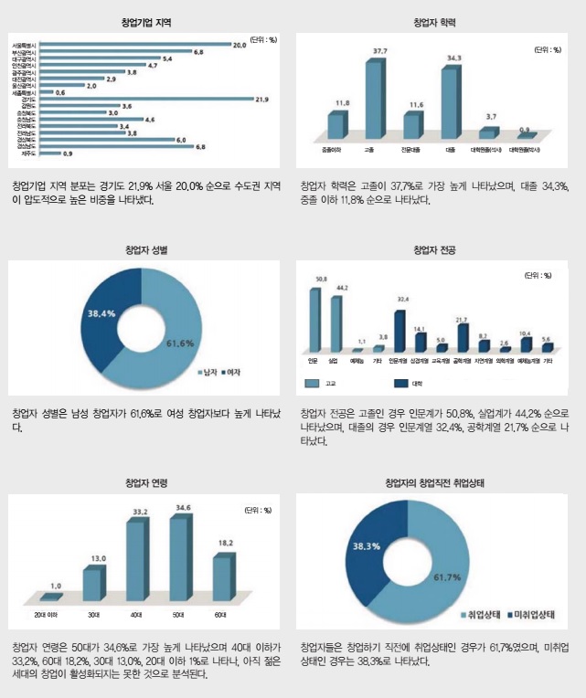 하지만 이러한 예산 지원에 비해 창업기업의 비중은 여전히 ‘생계형 창업’이 압도적으로 높다. 창업진흥원이 발표한 ‘2015 창업기업 실태조사 연구보고서’에 의하면 2015년 조사된 창업기업수(1~7년차)는 1,893,716개 기업으로, 이 중 도·소매, 숙박 및 음식점, 운수업, 제조업 등 1, 2차 산업 비중은 70%에 달한다. 창업기업 중 ‘혁신형 기업’이라 할 수 있는 벤처기업, 이노비즈기업, 경영혁신형기업 등은 전체의 1.4%에 불과하며 해당사항에 해당하지 않는 기업들은 98.8%에 달했다.