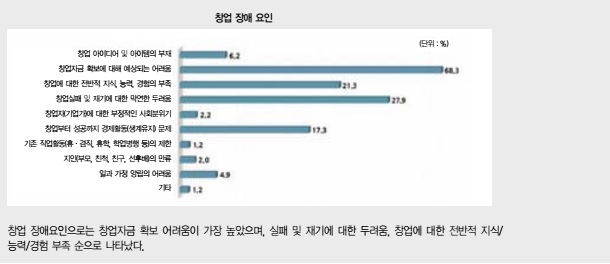 하지만 정작 기울인 노력에 비해 ‘기술력’을 바탕으로 ‘참신함’과 ‘혁신성’을 갖춘 ‘새로운 비즈니스 모델’의 발굴은 쉽지 않다는 것이 업계 전문가의 중론이다. 투자자 및 창업 컨설턴트들은 ‘창업 문화’의 변화가 시급한 상황이라고 언급하며, 단순한 ‘창업지원’이 아닌 스스로 자생 가능한 ‘창업생태계’ 조성에 더 관심을 쏟아야 한다고 지적하고 있다.