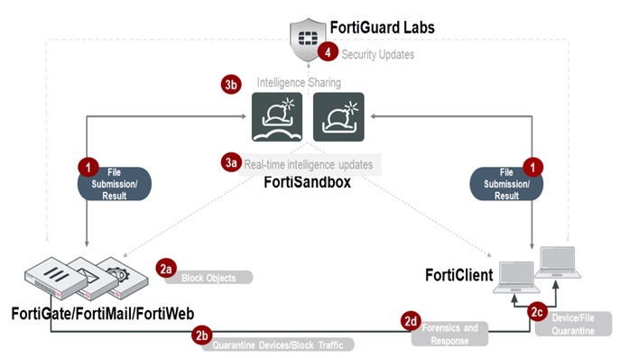 기존 엔드포인트 AV 솔루션과 같이 포티클라이언트(FortiClient)는 직접 호스트에 설치돼 AV 수행을 한다. 기존 AV 솔루션과의 가장 큰 차이점은 Botnet Detection, DNS 필터 기능을 직접 엔드포인트에서 수행할 뿐만 아니라, 의심파일을 포티샌드박스로 보내 동적 분석을 하고 결과 분석이 나올 때까지 파일 실행을 정지시키며 악성으로 분석될 경우, 실행파일을 격리조치 한다는 점이다. 그리고 포티클라이언트를 관리하는 포티클라이언트 EMS 솔루션은 감염된 호스트가 외부 통신을 하지 못하도록 격리 조치한다. 또한, 감염이 의심되는 호스트를 EMS에서 바이러스 검사 및 취약점 분석을 실행한다.