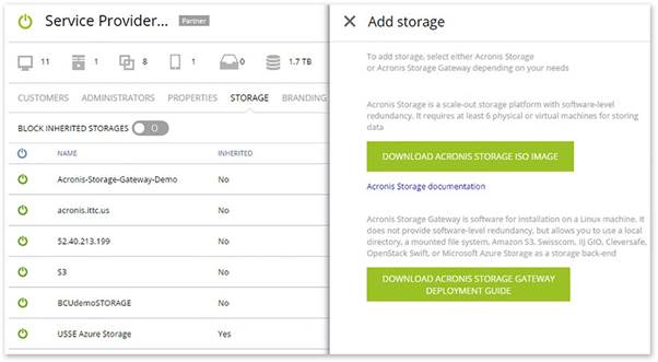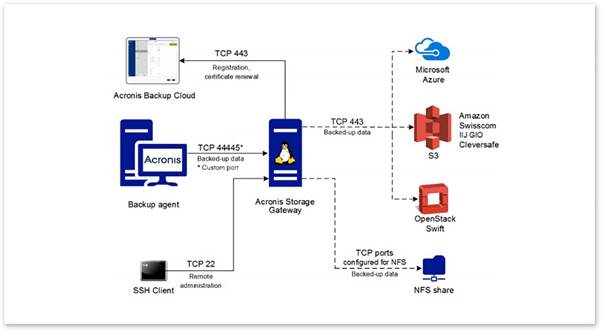 ‘아크로니스 스토리지 게이트웨이(Acronis Storage Gateway)’는 모든 아크로니스 파트너들에게 무료로 제공되는 ‘아크로니스 백업 클라우드(Acronis Backup Cloud)’의 한 구성요소로, 고객의 백업 서비스로 사용되는 거의 모든 스토리지를 손쉽게 설정할 수 있도록 지원한다. 해당 멀티테넌트(Multi-Tenant) 게이트웨이 소프트웨어는 NFS를 통한 기존 스토리지 인프라로의 연결이나 마이크로소프트 애저(Microsoft Azure), 아마존 S3(Amazon S3), IBM 소프트레이어(IBM SoftLayer), 오픈스택 스위프트(Openstack SWIFT) 등 프라이빗 서드파티 스토리지 서비스로의 연결을 모두 지원한다.
